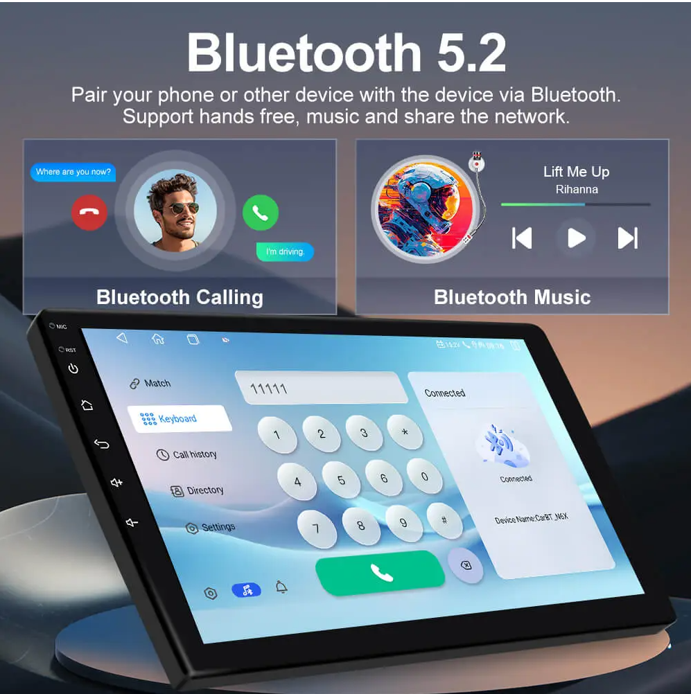 Toto autorádio podporuje bluetooth funkce, díky kterým můžete za jízdy pohodlně telefonovat, vyhledávat telefonní kontakty. Pro příjem či ukončení hovorů lze za jízdy použít i multifunkční volant. V případě příchozího či odchozího hovoru se volaný kontakt či telefonní číslo zobrazuje na displeji autorádia.